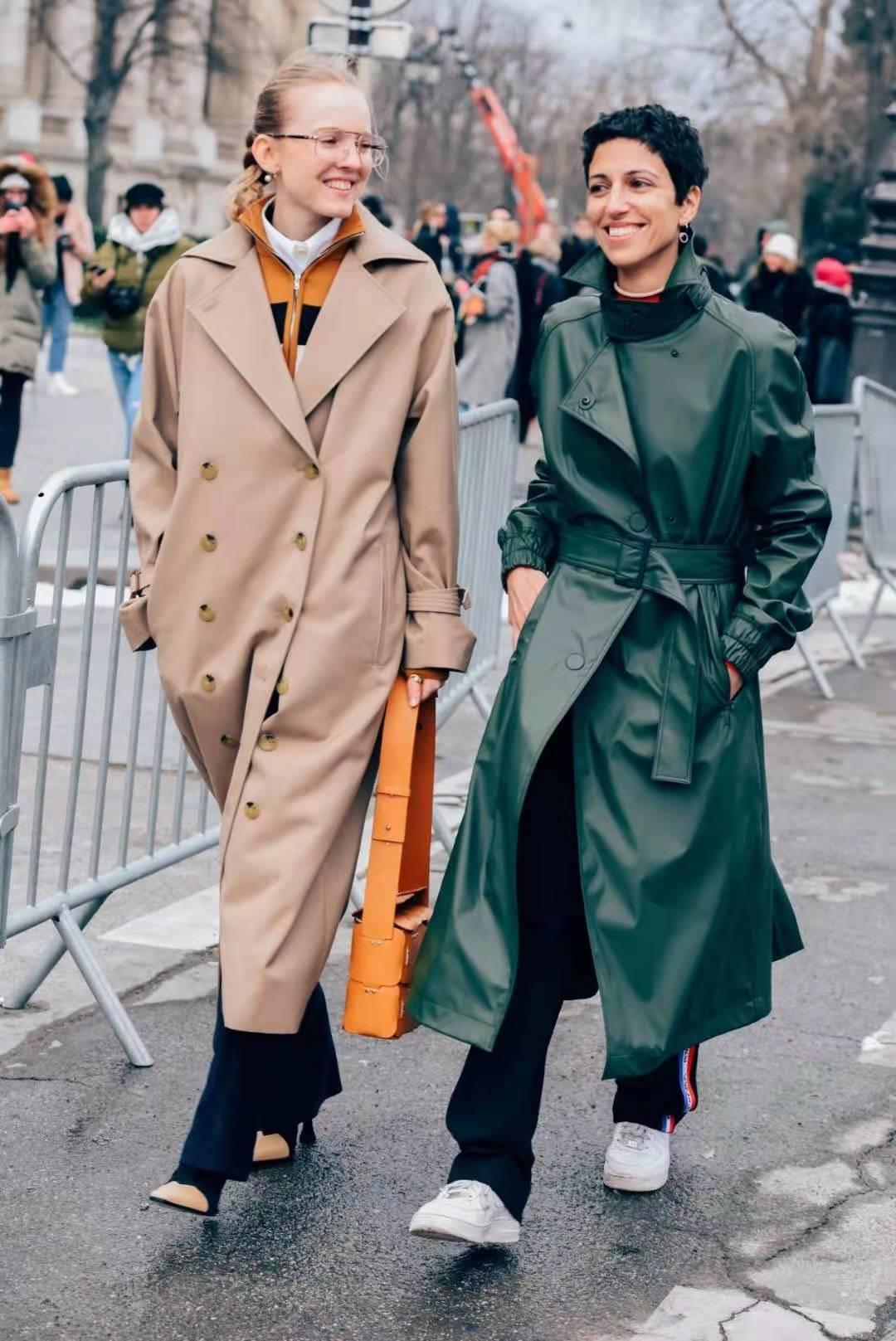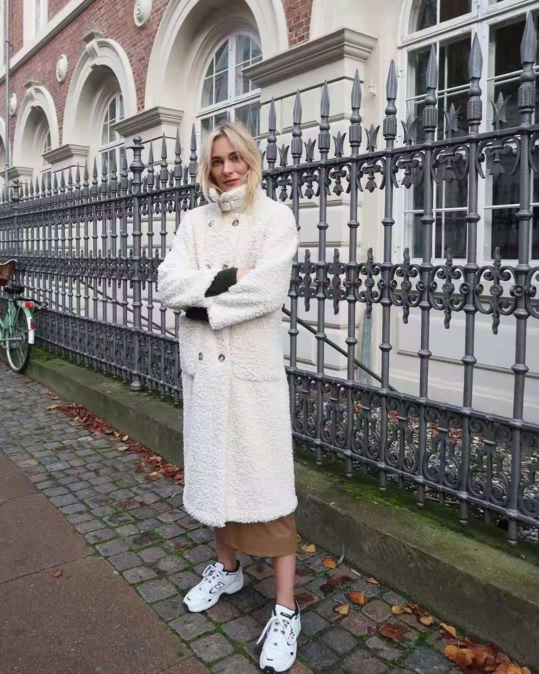 运动鞋也是一种非常百搭的存在,搭配大衣也没有任何违和感,反而可以显得相当时髦。小白鞋自带一种干练清新的感觉,无论是通勤穿还是上街穿都是相当的合适,搭配同样是浅色系的大衣就可以了。