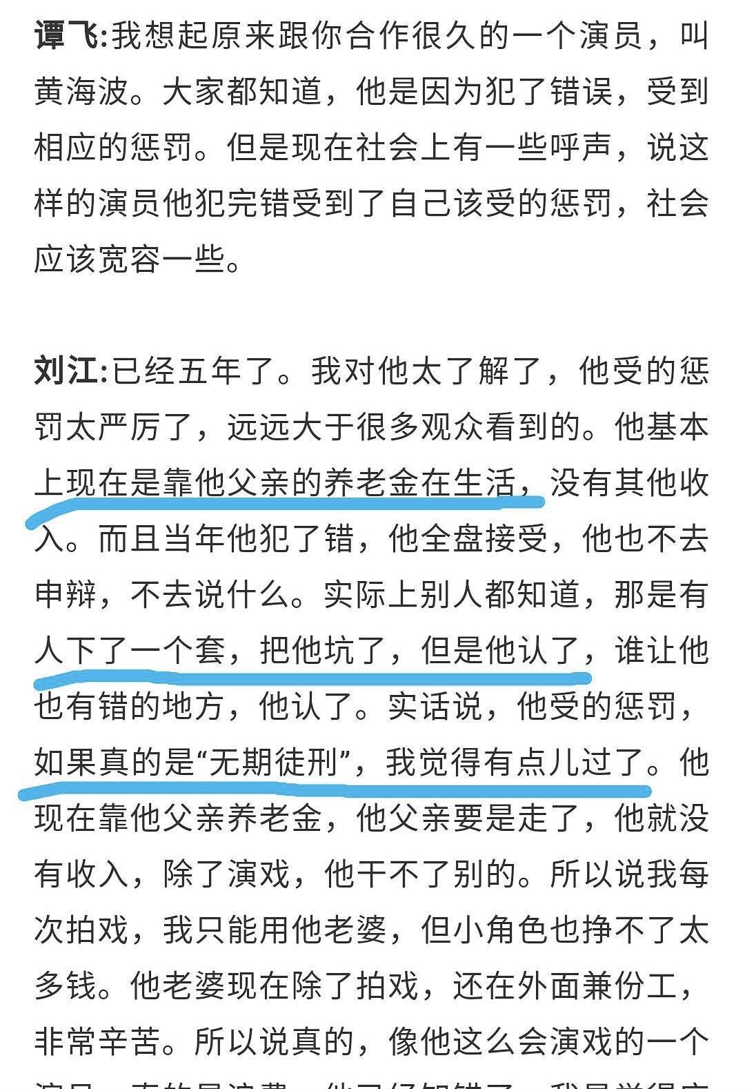 刘江在采访中还提到黄海波目前的现状实惨,没有剧拍没有收入需要靠父亲的养老金生活。