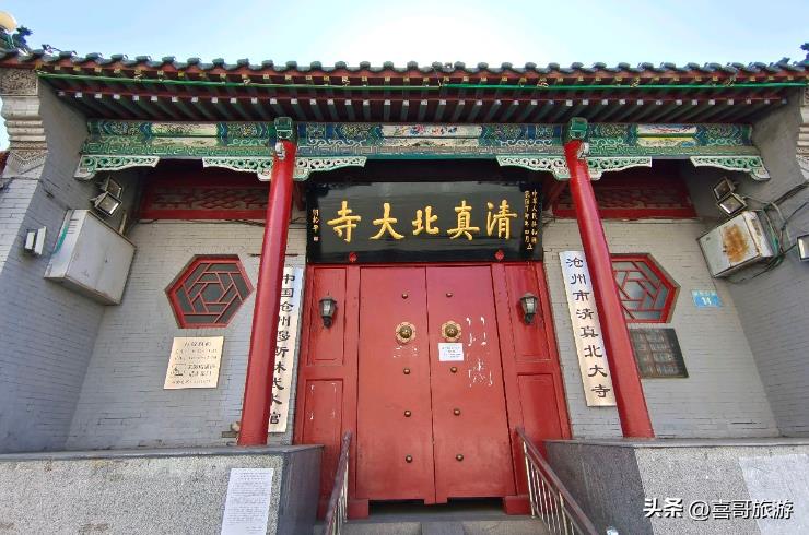 清真北大寺,位于河北省沧州市区解放中路回民聚居区的中心,为中国四大清真寺之一,与广州怀圣寺、泉州清真寺、济宁清真寺齐名。著名的穆斯林聚集地,第一部汉译《古兰经》就在此诞生。该寺始建于明朝建文末年,历时18载,于1420年落成,主建人是原北大寺主教阿訇吴学孟的十六世掌教祖先吴氏。寺大门坐东面北,占地面积8000平方米,总建筑面积3008平方米。其中礼拜大殿1350平方米,殿堂1080平方米,砖木结构。大殿庄严宏伟,由前中后三殿和古棚组成。殿顶上有“五脊六兽”,雕刻精细,栩栩如生。后窑池有三亭,中间高,两边低,为驼峰式,又似笔架属文式木制结构,别具一格,许多国家信奉伊斯兰教的朋友都慕名前来参观、礼拜。