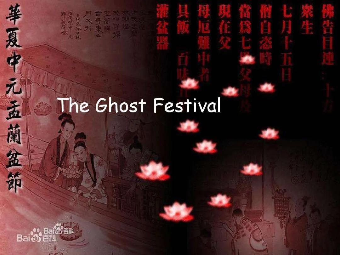 道教称中元节,佛教称盂兰盆节。它是在农历七月十五。像清明节一样,人们会准备祭品,烧香和纸祭奠死去的人。通过这些活动,人们表达了对祖先的思念。