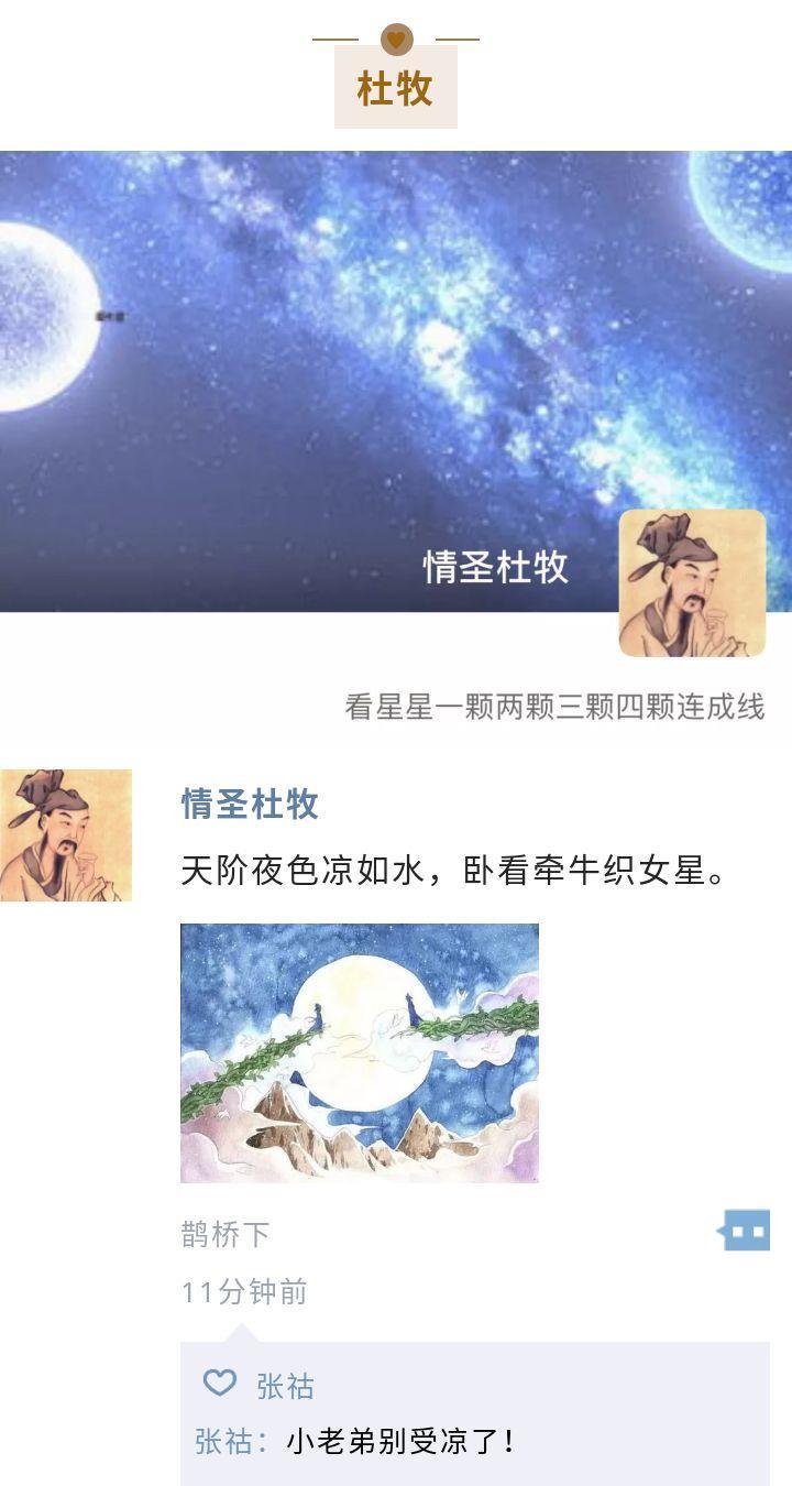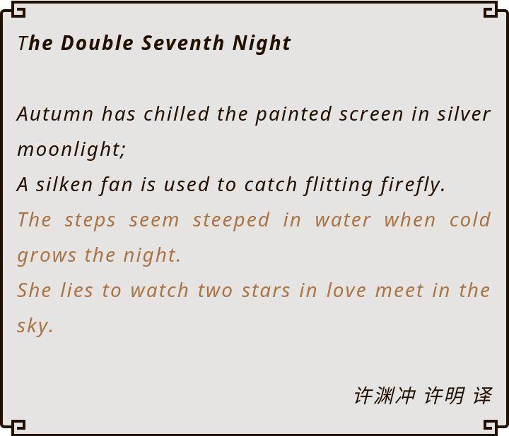 “天阶夜色凉如水,卧看牵牛织女星。”出自杜牧的《七夕》。让人想到夏目漱石关于I love you的经典翻译——今晚月色真美,这样的美好时刻想马上和你分享。