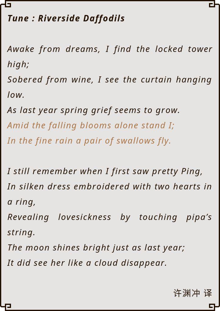 梦后楼台高锁,酒醒帘幕低垂。去年春恨却来时。落花人独立,微雨燕双飞。