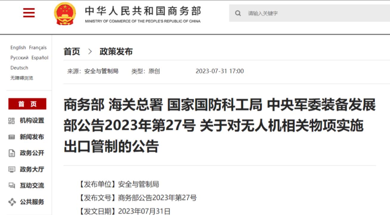 近日,我国发布消息称,四部门决定对特定类型的无人驾驶飞行器实施出口管制,以维护国家安全和利益。