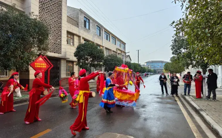 彩纸扎就采莲船,中坐年轻少女,划船为一老汉,旁有丑角“干奶娘”。小船在锣鼓声中起舞,船夫撑篙,小船轻快地趋前退后,或原地转圈,作起伏摇晃状。锣鼓停,船佚挟船舷,唱采莲船词,一唱众和,唱完一段后再起舞如前。“干奶娘”则前后左右插科打浑扮怪相,逗引观众。