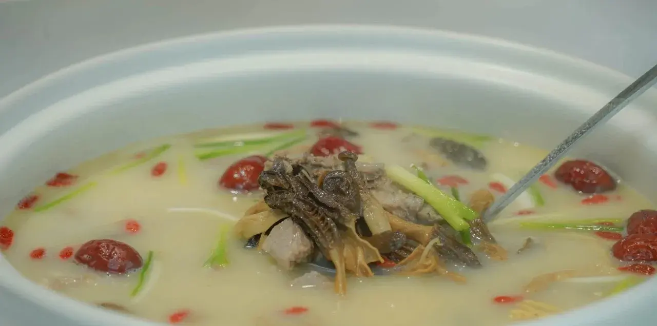 向桥石耳土鸡汤,石耳,中药名,为石耳科真菌石耳的地衣体,采自向桥山区的悬崖绝壁石缝中,具有养阴润肺清热解毒的功效。鸡汤中还加入了是枸杞,人参,天麻,红枣等中药材。将几种中药材和土鸡一起煲两到三个小时,这样慢慢煲出的汤不管是中药成份还是营养成份都溶解在汤里很容易被人体吸收。