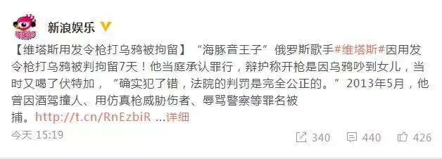 俄罗斯歌手维塔斯这几天被传因为用发令枪大乌鸦被判拘留7天。