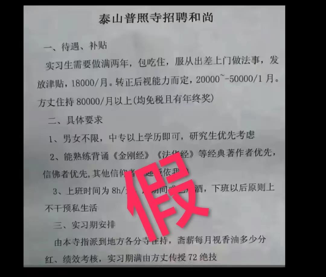 除此之外,这几年网络上一直有很多关于寺庙招聘和尚的信息在乱传,这些招聘信息内容大同小异,只不过是寺庙和地点发生变化而已。