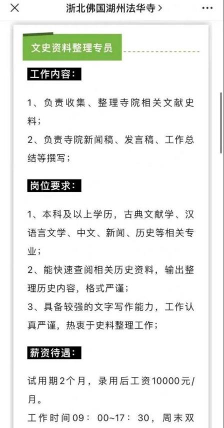比如在2022年7月份的时候,浙北佛国湖州法华寺曾经发布过一则招聘信息,这则招聘信息并不是招聘和尚,而是一些普通职位,其中文史资料整理专员录用后工资达到1万元每个月,而且周末双休;另外包括厨师,园林绿化维护员等一些普通岗位,月薪也可以达到7000元到1万元不等,另外这两个岗位还包食宿,也就是说1万块钱基本上都是拿到手的净收入。