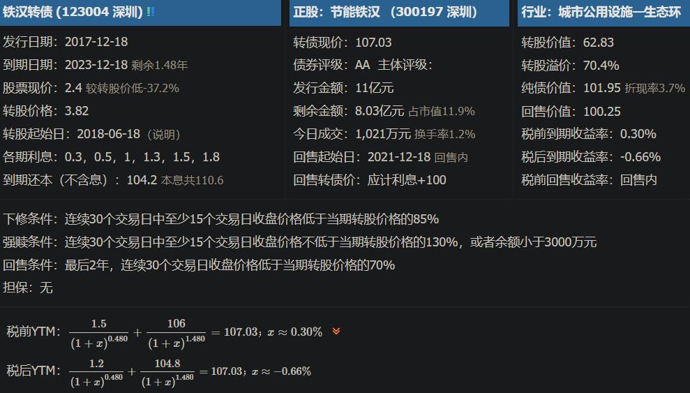节能铁汉(300197.SZ)当前(2022-6-26)价格为2.4,铁汉转债(123004.SZ)价格为107.03。本文仅作为案例分析,不提供投资建议。