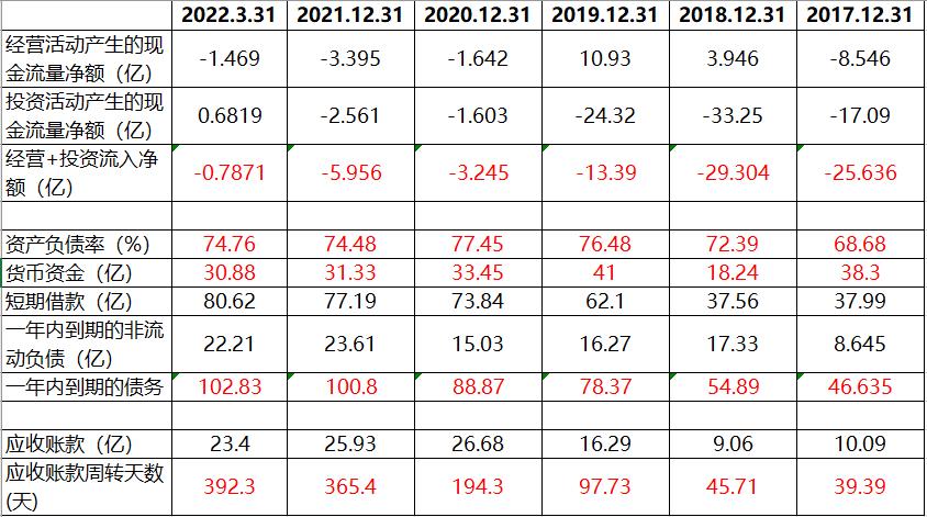 从公司的资产负债率看,虽然21年向大股东定增后有所回落,但当前负债率依据接近75%,而且公司一年内到期的债务(短期借款+一年内到期的非流动负债)22年q1加起来高达102亿,而当前公司的现金储备只有30.88亿,哪怕公司8月底简易小额定增完成也只会带来3个亿的现金流入,对于公司的高额短期债务相比,只是杯水车薪。