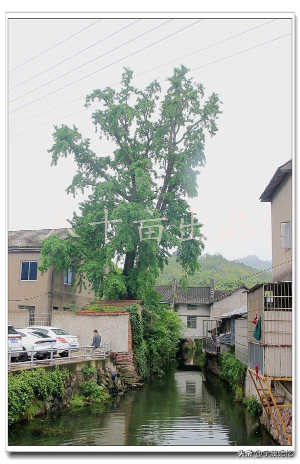 石湫古银杏树,1996年被列为北仑区古树名木。河上建筑为水阁凉亭。