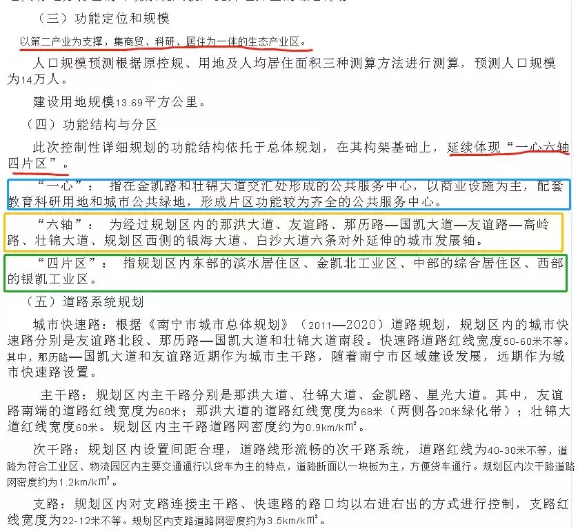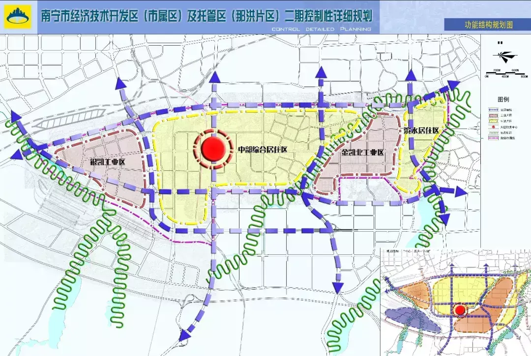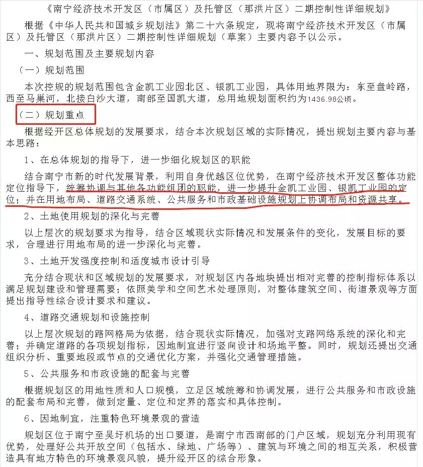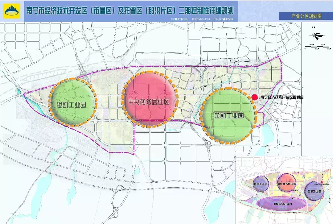 《经开区二期详控规划》的原文件中明确指出,新规划的重点是统筹协调与其他各功能组团的职能,进一步提升金凯工业园、银凯工业园的定位;并在用地布局、道路交通系统、公共服务和市政基础设施规划上协调布局和资源共享,将南宁经济技术开发区(市属区)以及托管区(那洪片区)定位为以第二产业为支撑,集商贸、科研、居住为一体的生态产业区,延续体现总规划上的“一心六轴四片区”的构想。