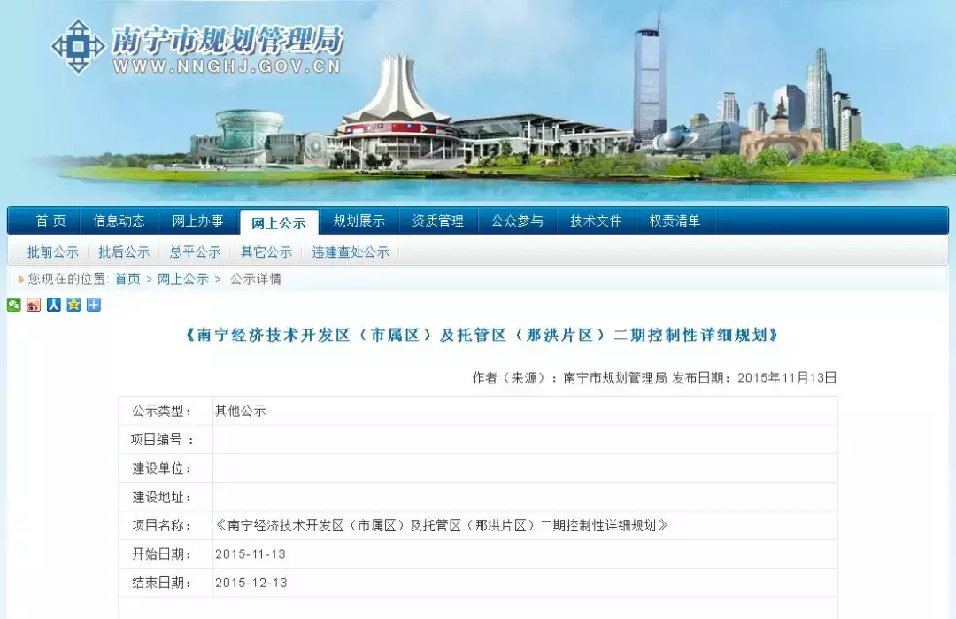 3月2日,南宁规划信息港挂出一条关于南宁市江南经济开发区的新规划——《南宁经济技术开发区(市属区)及托管区(那洪片区)二期控制性详细规划》,如下图所示。