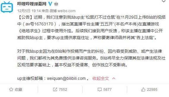 不知道当事人算是恼羞成怒,还是戳到了痛点,又或者UP主“松鼠打不过仓鼠”的过激言论,卢本伟威胁了UP主,索要家庭地址并且声称要告上法庭。而这件事,也正好的卷入了其他相关者。首先是B站表示,将会维护自己的UP主的利益;而相对的,卢本伟维护自己没有开挂的同时,也责怪某鱼不出面维护自己的主播。卷入了B站和斗鱼两个平台之后,事情就开始变质了。B站的粉丝和某鱼的粉丝也卷入了其中,有批评某鱼的有不明真相说B站不该参与的,此时卢本伟的行为反而成为了很多人眼里的破绽:既然没有开挂这么激动干嘛?而B站的行为被赞扬说是维护UP利益,也有批评者说B站的立场偏向或者说不该趟浑水。而某鱼的不作为,也被人看作是卢本伟坐实了。