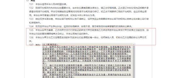 中国质量新闻网在李女士提供的尚德机构网络培训服务协议上看到,本协议自甲方盖章(尚德机构方),乙方(李女士方)向甲方交付付款验证码并支付甲方收费或乙方点击同意本协议并支付甲方收费之日起生效,自本协议约定的服务期限结束之日终止,本协议另有约定的除外。本协议为甲方与乙方签署且生效的针对此协议约定课程的唯一协议,任何其他人员、机构与乙方签署的协议与甲方无关。