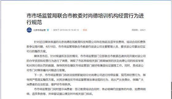 尚德暴露的诸多问题,也引起市场监管部门注意。据北京市市场监管局官方微博消息,针对近日媒体报道的北京尚德在线教育科技有限公司存在拖延应退学员费用,培训合同扣费条款争议等问题,4月18日,北京市市场监管局联合北京市市教委约谈该公司主要管理人员,要求该公司拿出切实可行的整改方案。对其涉嫌违反市场监督管理法律法规的行为,将从严从快查处。同时,责成该公司专门对媒体曝光问题进行答复。