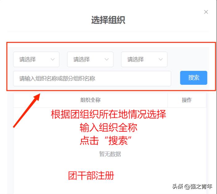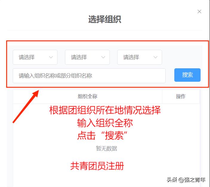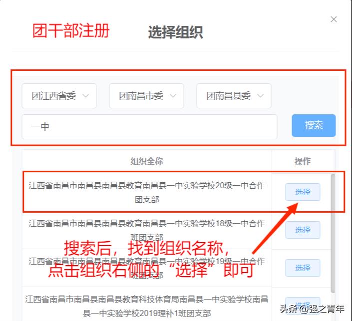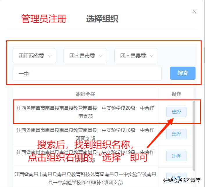 ②根据实际情况选择团组织,输入注册组织名称后,点击搜索,找到组织后,点击转入组织右侧的“选择”按钮即可。