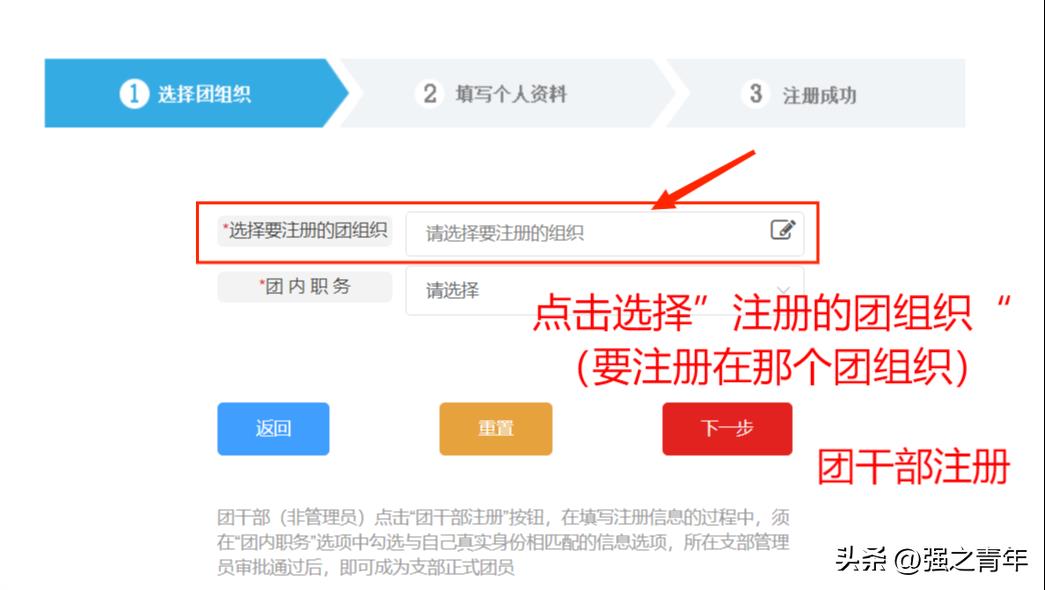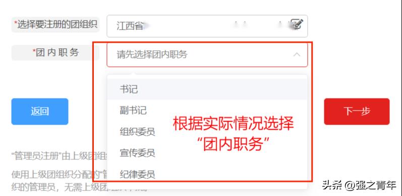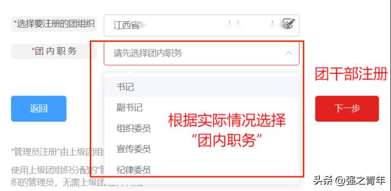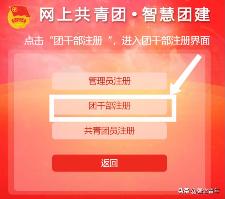 3、进入注册界面后,根据实际情况选择“管理员”身份/“团干部”身份/“共青团员”身份。