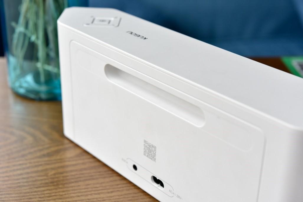 在音响的后侧设计有一个手提凹槽,可能有不少人把酷狗潘多拉网络音响送给父母跳广场舞用,这样一来平时随身提着的时候也比较方便。下方是AUX接口以及电源接口,所有需要外接插线的位置都设计到机身后侧,这样一来机身正面看上去就十分的简洁利落。由于机身内部没有内置电池,因此酷狗潘多拉网络音响必须在有插座的地方才能使用,这也算是比较遗憾的一点吧。