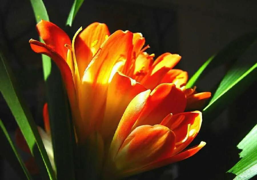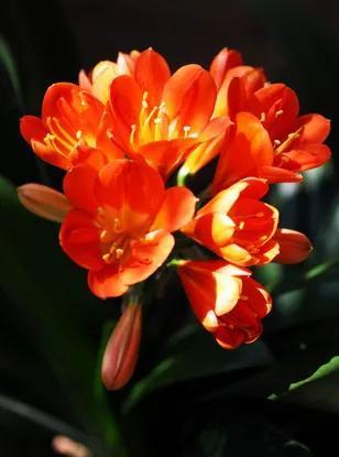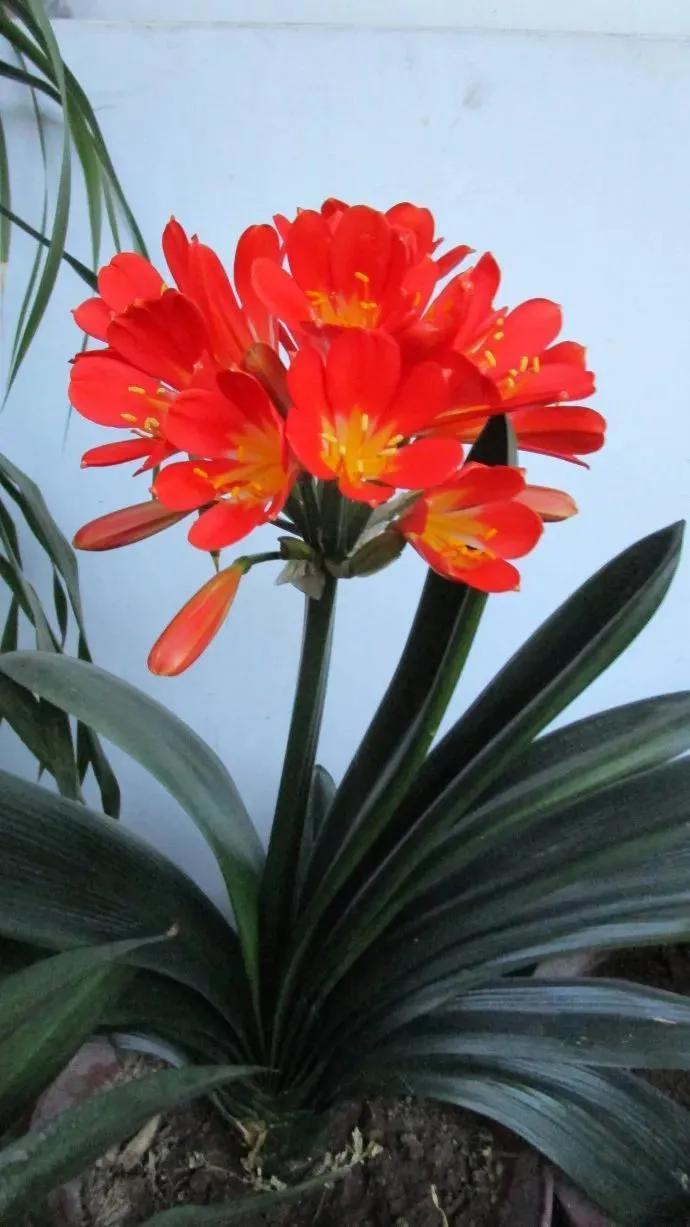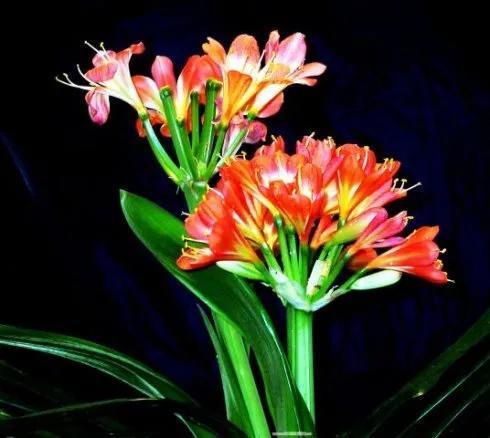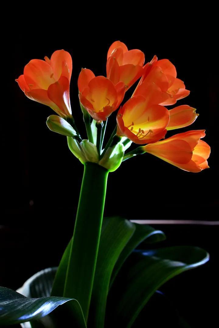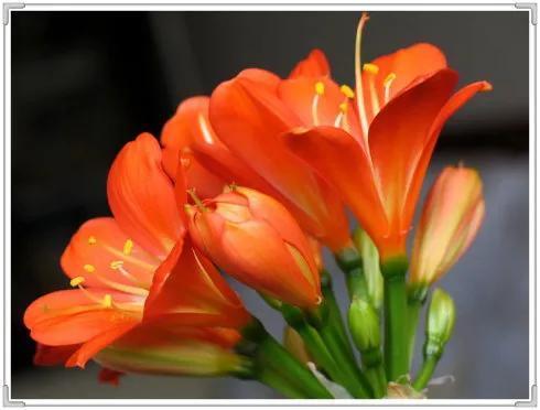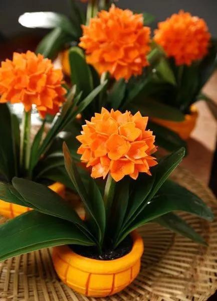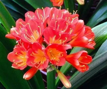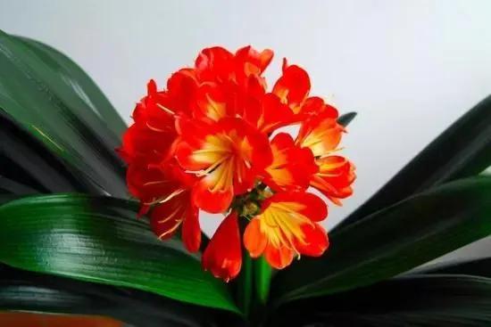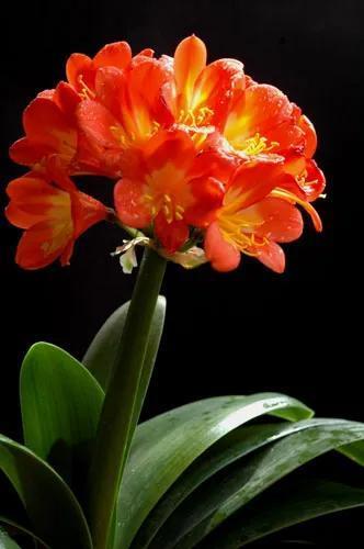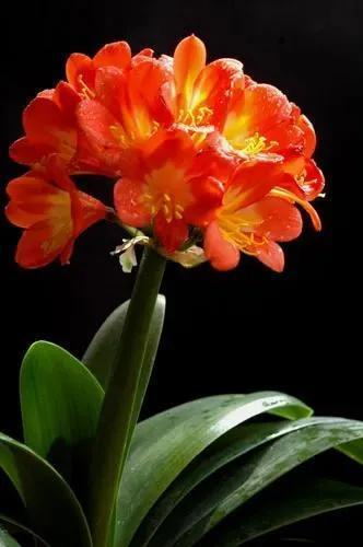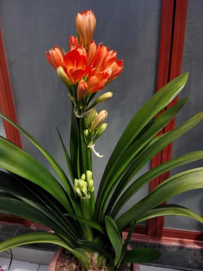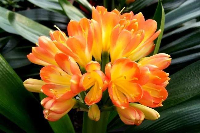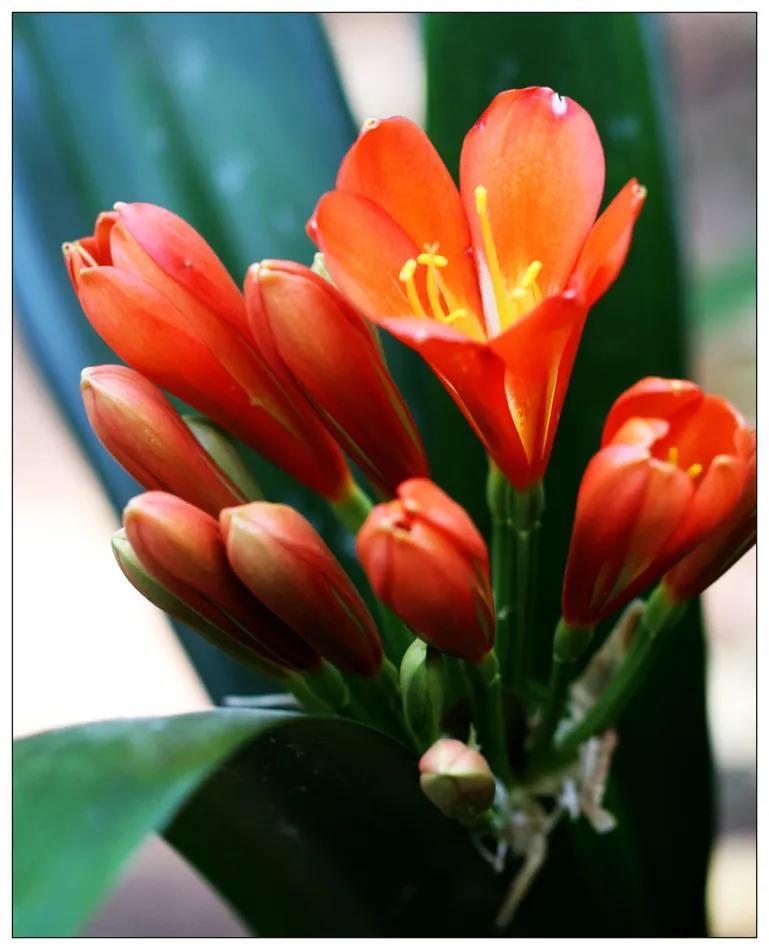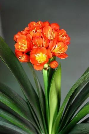 君子兰的花朵从叶片中间开放,一枝花剑从中抽出,顶上长出一个个的小花苞,等到每一朵小花苞都盛开后,就成为一个洪圆形的大花球,整株花就变得端庄而又美丽,秀丽而又迷人。
