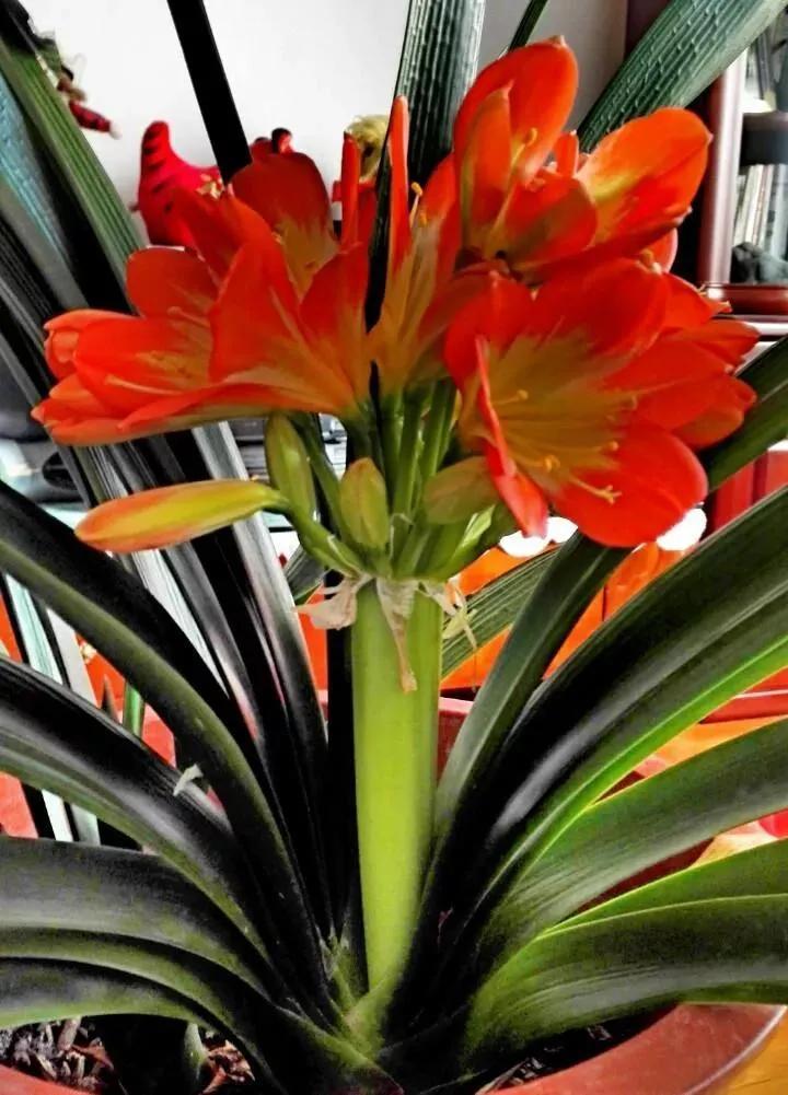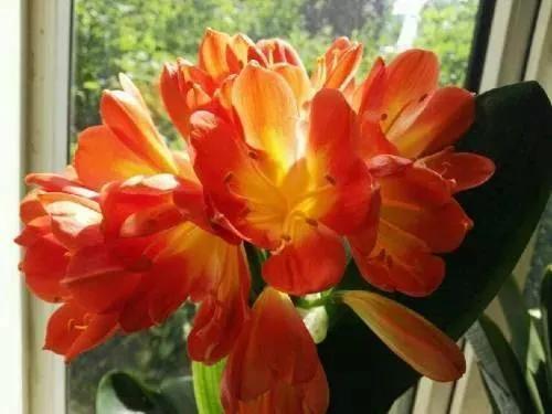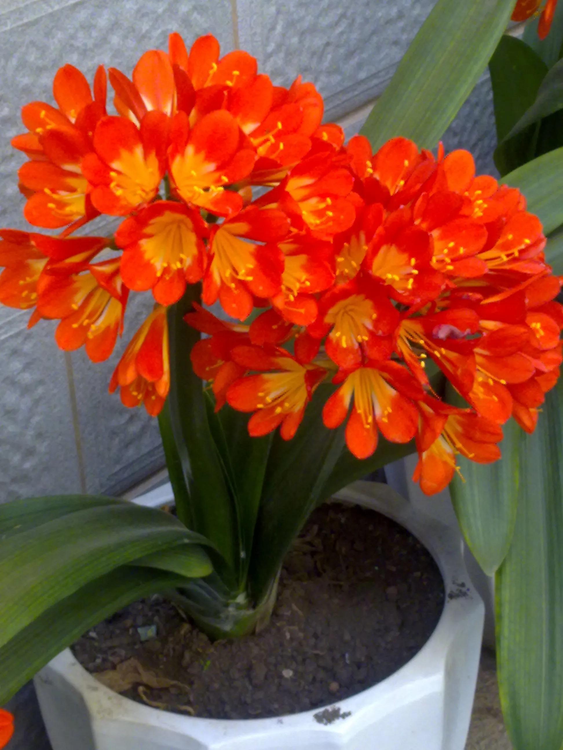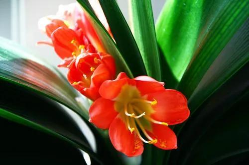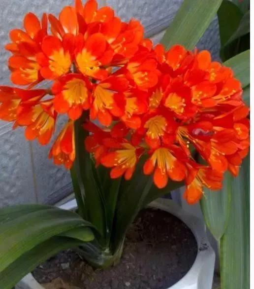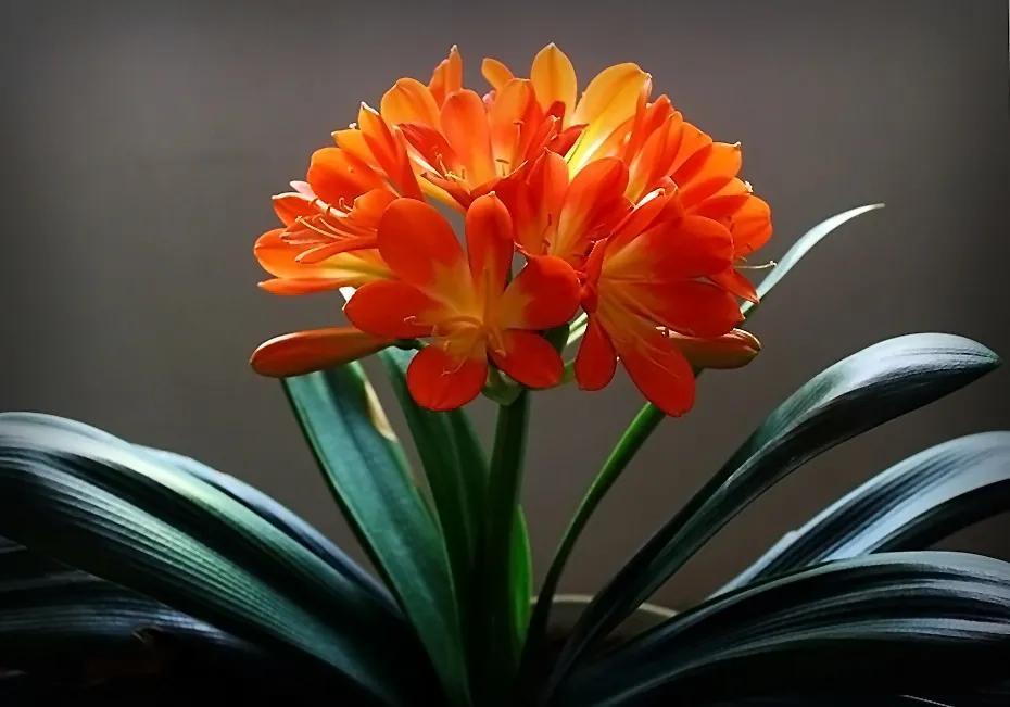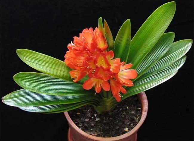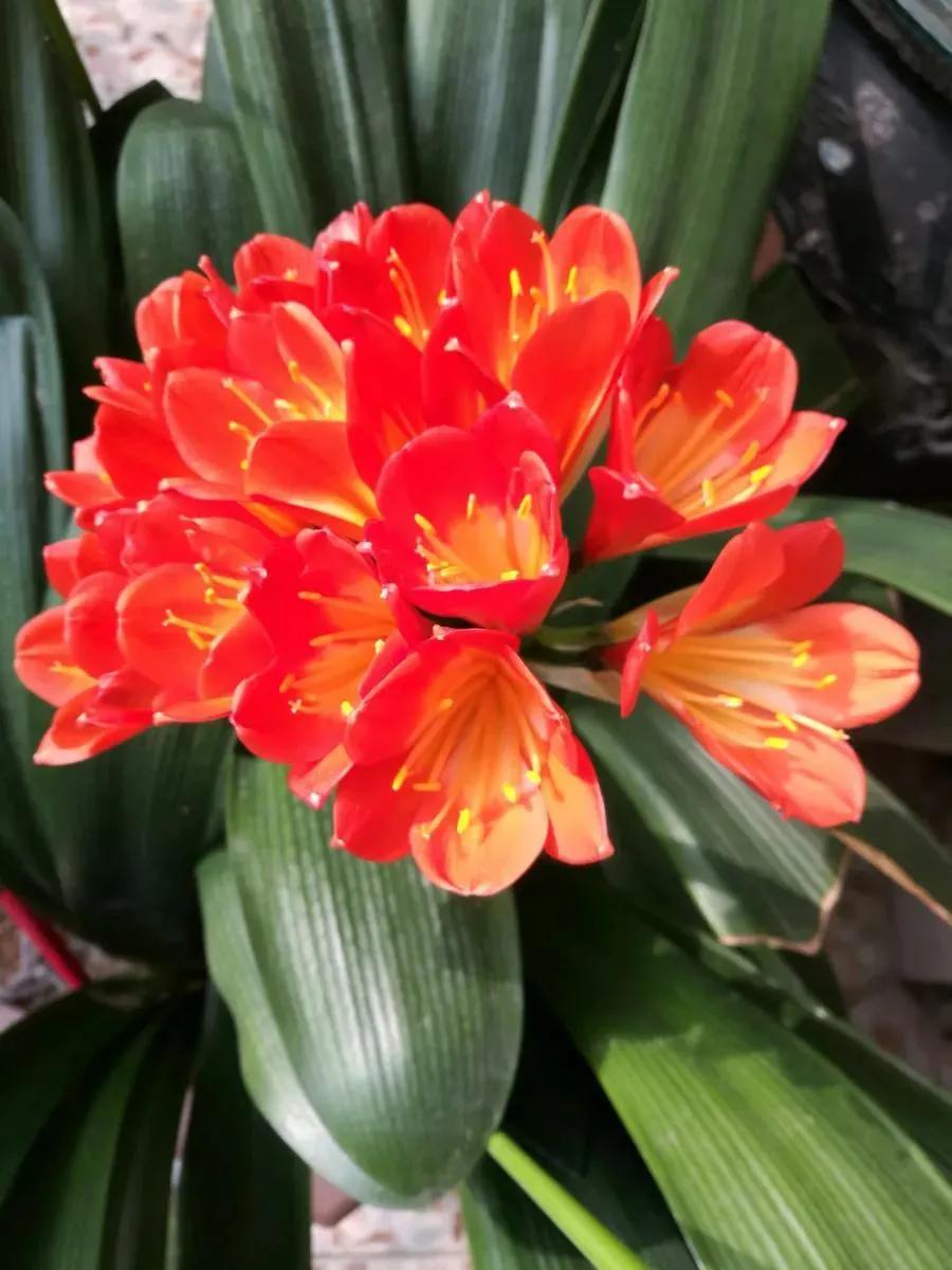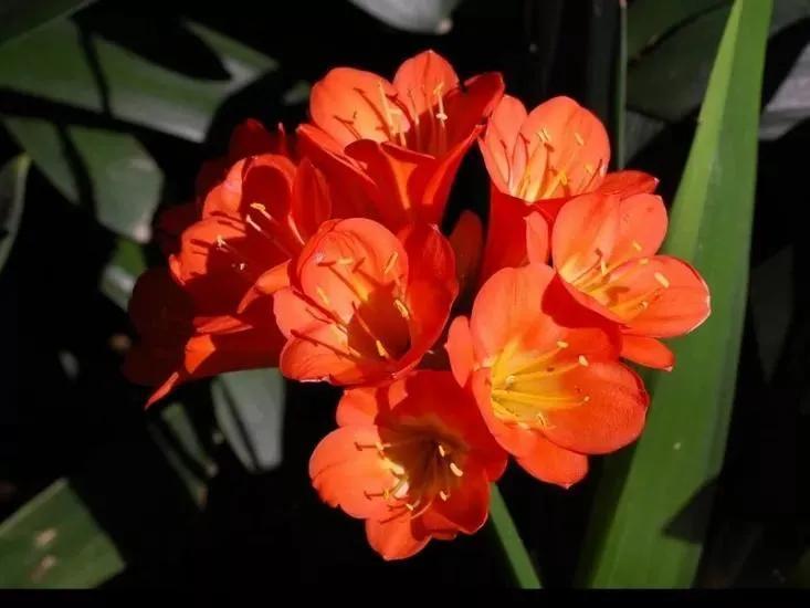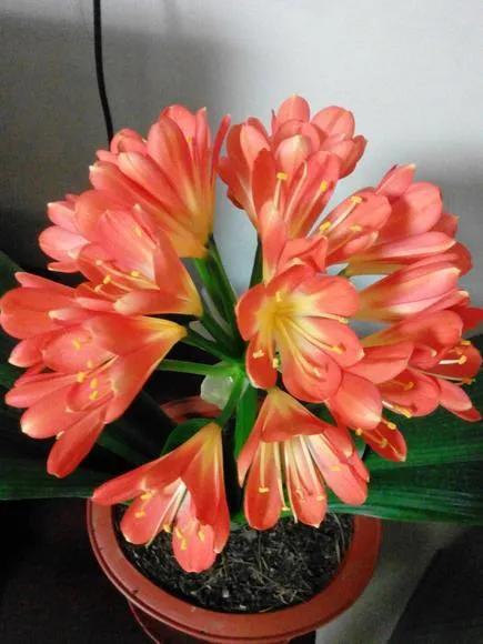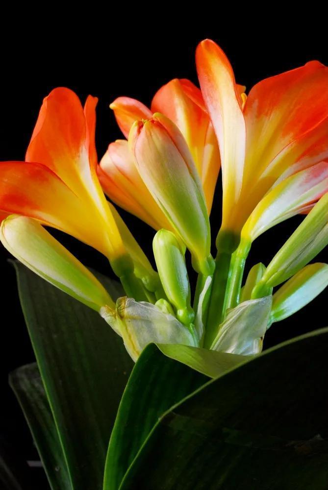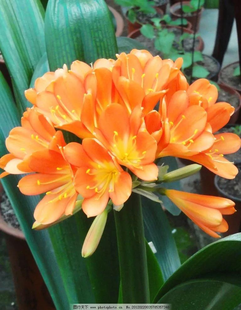 君子兰的花朵从叶片中间开放,一枝花剑从中抽出,顶上长出一个个的小花苞,等到每一朵小花苞都盛开后,就成为一个洪圆形的大花球,整株花就变得端庄而又美丽,秀丽而又迷人。