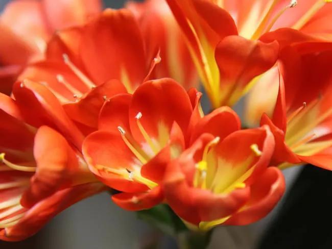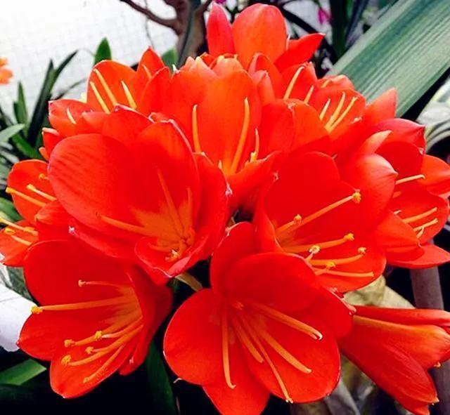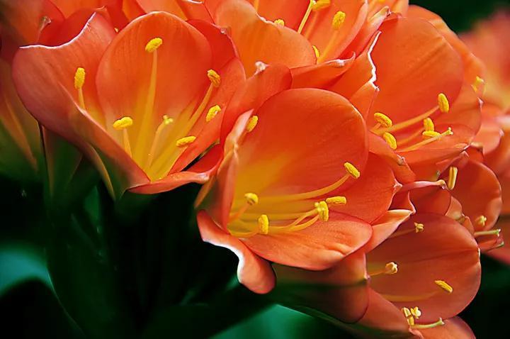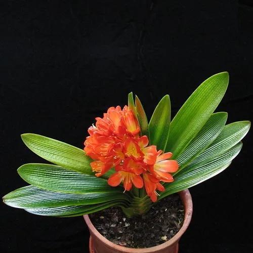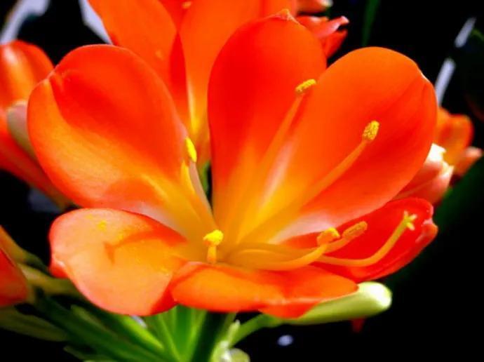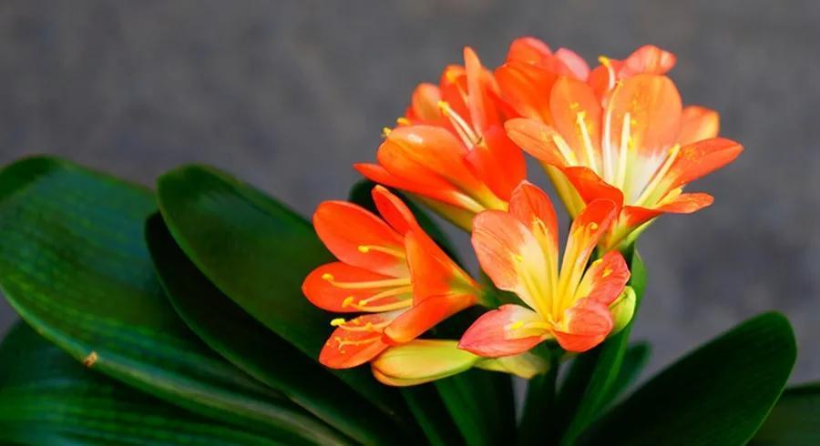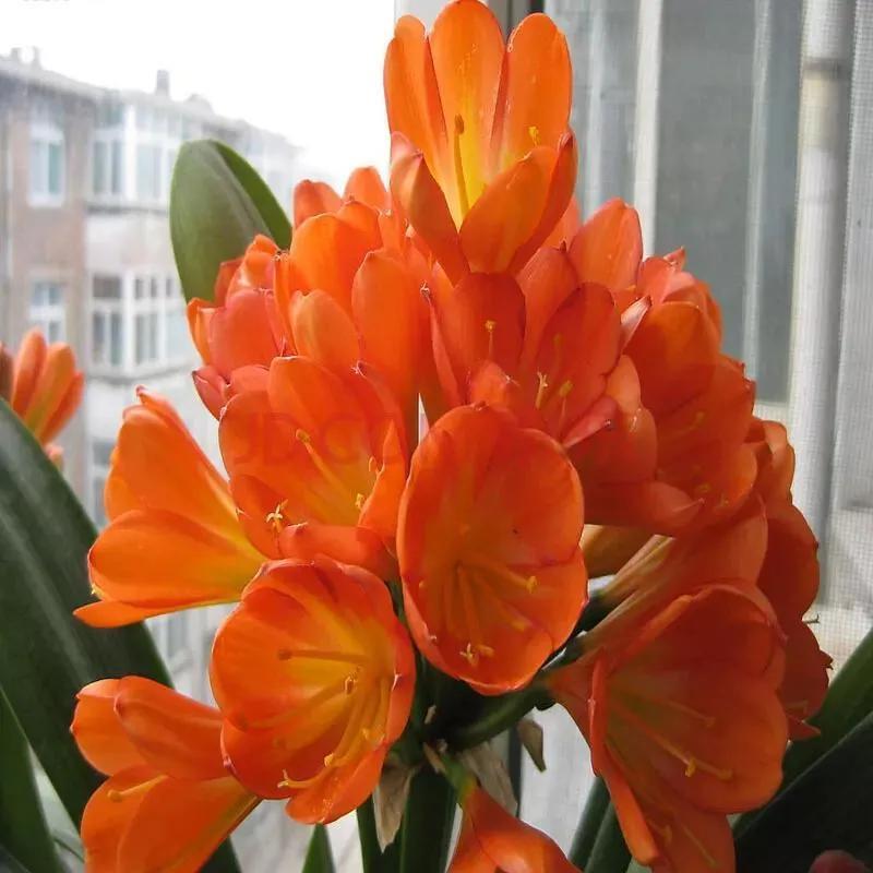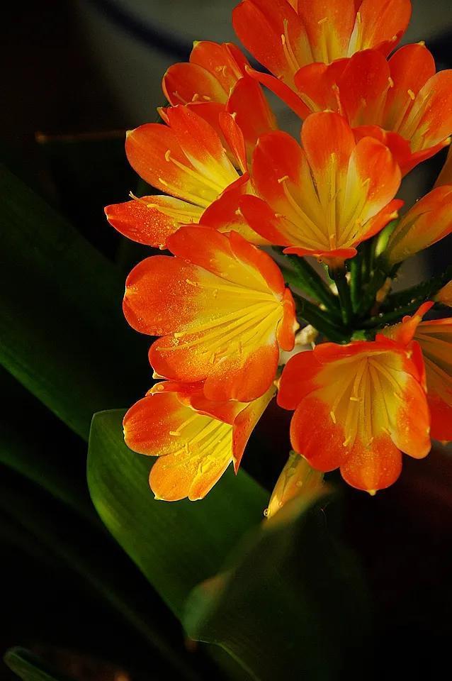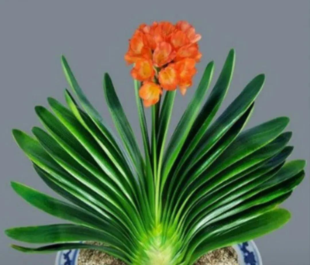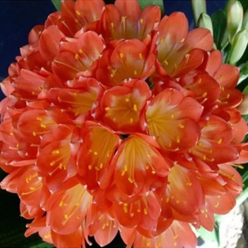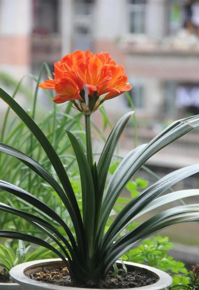 君子兰的花朵从叶片中间开放,一枝花剑从中抽出,顶上长出一个个的小花苞,等到每一朵小花苞都盛开后,就成为一个洪圆形的大花球,整株花就变得端庄而又美丽,秀丽而又迷人。