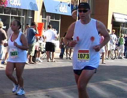 18.男性跑马拉松时, 记得贴上乳贴. 如果没有乳贴, 贴两张创可贴也行, 要不, 一圈跑下来, 你会变成这样.