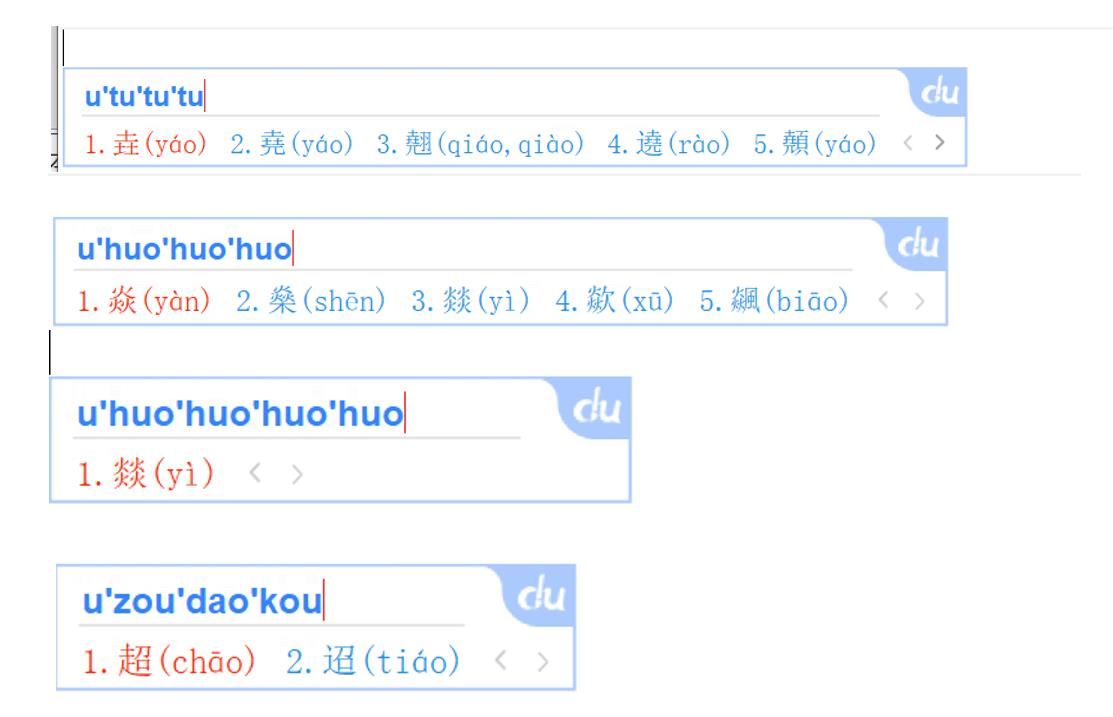 14.打字的时候, 经常知道一个字怎么写, 但是不知道怎么读? 这个时候该怎么把这个字通过输入法打出来呢? 试试先输入一个字母"u", 然后把你想打的那个字, 分拆出来, 看看会不会被识别出来?