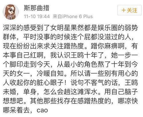 10日凌晨,《余罪》“大嫂”徐冬冬连发几条微博,暗讽王鸥:“jian不是第一次jian了,三都不是第一次三了,还差这一次吗”。