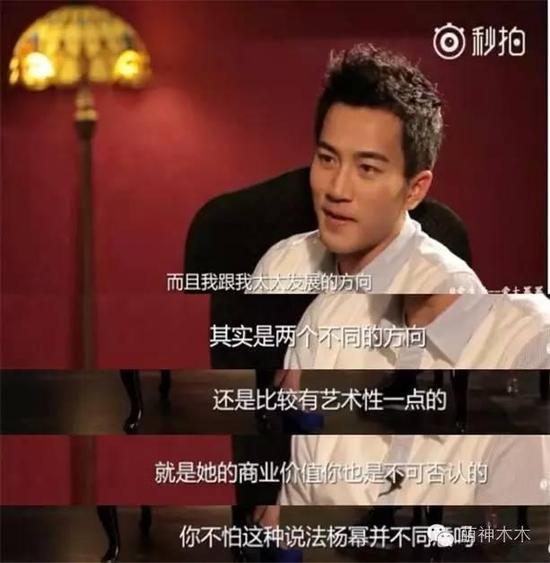 记得之前刘恺威上节目,称杨幂更具商业性,而自己则更具艺术性。言下之意就是说,杨幂拍的都是没有营养的,而自己则更具内涵。之后杨幂也上了该节目,被主持人问到这个问题时,杨幂只能婉转地说,自己不同意这种说法。