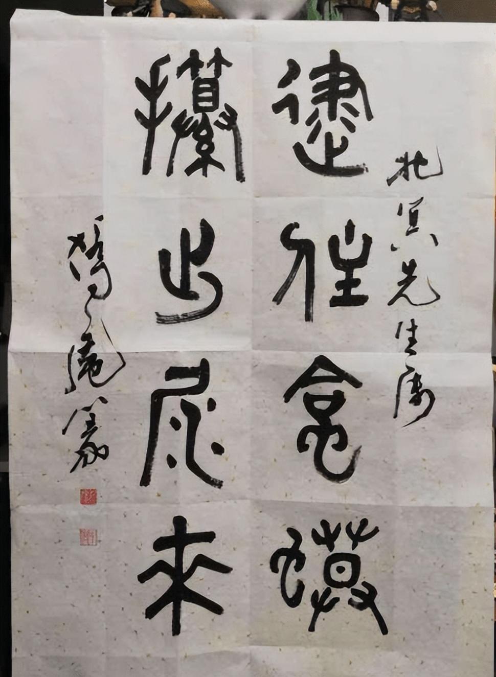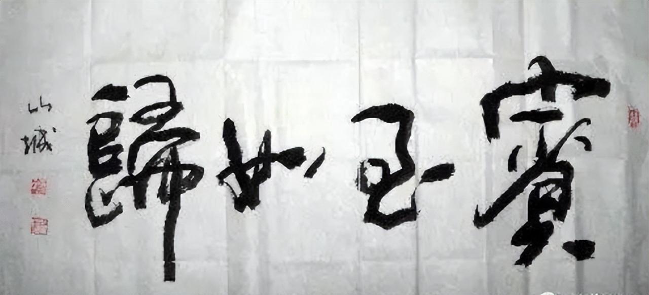 这个作品,同样也要从右往左读,如果是懂得书法的朋友,他们很容易就能认出来,这四个字是“宾至如归”!当然像我这样虽然不懂书法,但多少又认得几个繁体字的人来说,当然就是“妇女之宝”了!