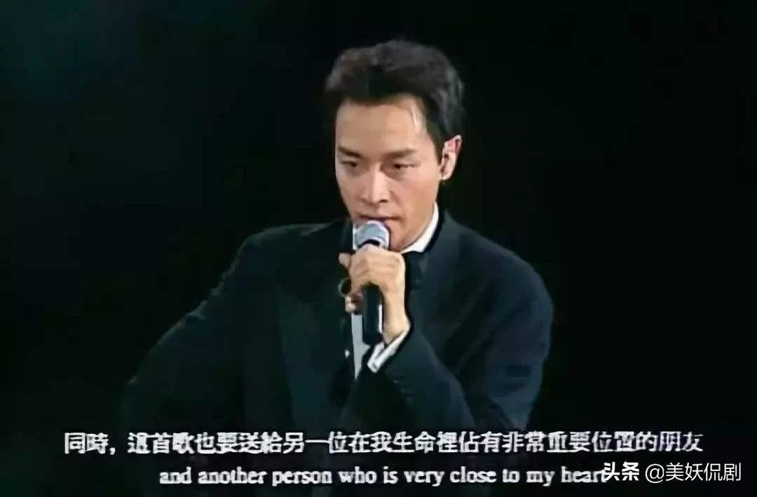 在香港红馆举行的1997跨年演唱会上,张国荣穿着一身黑色的西装打着领结出现在了舞台上,此时他将要带来的是一首《月亮代表我的心》。