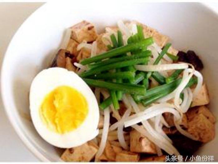 8、待煮至板豆腐丁入味上色后,用铲子盛入大碗里。然后在上面放入煮好的面条,摆上氽烫好的豆芽菜、韭菜、水煮蛋,即可。