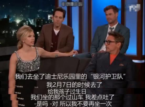 女神斯嘉丽·约翰逊(Scarlett Johansson)说她曾经去玩过迪士尼乐园过山车——“银河护卫队”。 但当时没看到钢铁侠——小罗伯特·唐尼(Robert Downey Jr.),钢铁侠直言那次他没去,之前陪孩子过生日去过,太刺激差点吐了,决定再也不坐那玩意儿了。