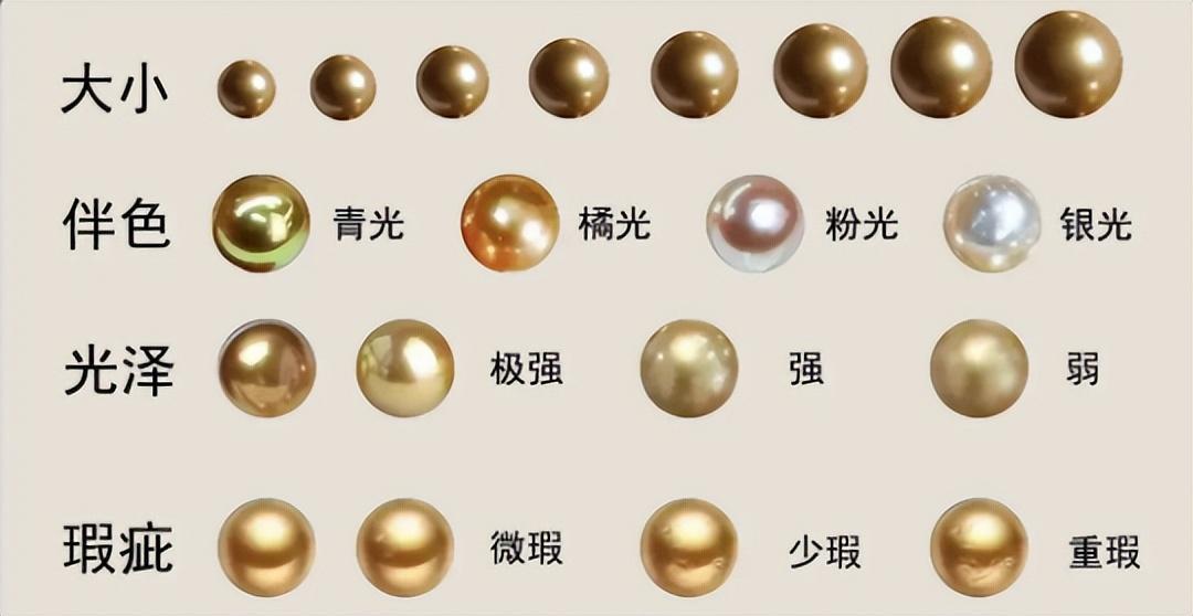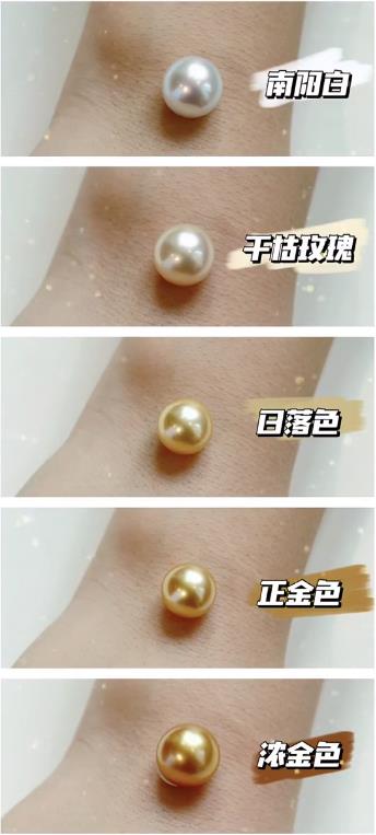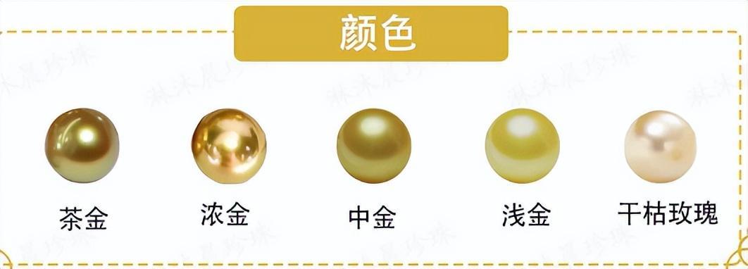 南洋金珠的颜色主要有香槟色、浅金、中金、特浓、茶金等色,南洋金珠颜色是越浓越贵,金珠大小相同的情况下,浓金带绿的价格会比中金贵 30%甚至更多,而浓金带绿色伴彩的俗称“茶金”,价格更高。具体可分为:茶金-浓金-中金-浅金-干枯玫瑰金。