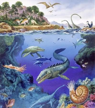 海洋中生存着菊石、以及厚壳蛤,为海洋的繁盛动物,厚壳蛤一度取代珊瑚成为主要的造礁生物。有孔虫门的球截虫科与棘皮动物(如海胆、海星)继续存活。白垩纪海洋中出现了最早的硅藻,黄昏鸟目是无法飞行的原始鸟类,可以在水中游泳。白垩纪末,恐龙、菊石和其他生物类群大量绝灭。淡水无脊椎动物,如甲壳类的介形虫、软体动物中的螺和蚌广泛分布。