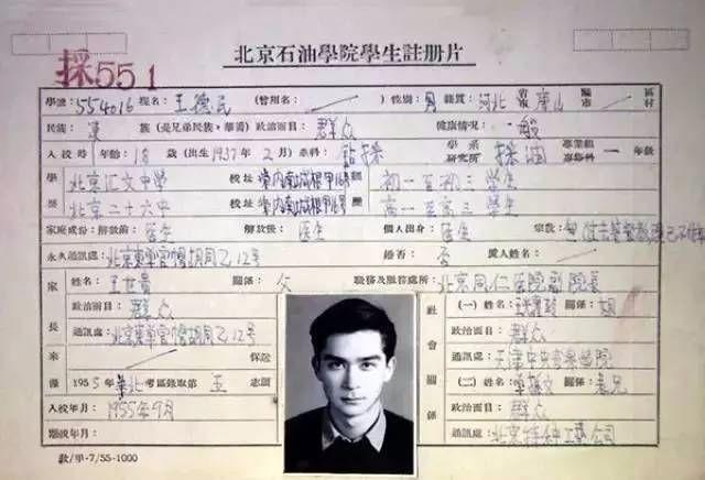 不过王德民在母亲的谆谆诱导下,从小就能说出一口流利的英语。但他也有一个弱项就是学汉字比较吃力,经过一番努力后他克服了识字困难在中学成绩非常突出。上中学的他在做事上就显出超越同龄人的有主见,给自己定了明确的目标—一定要考上清华或者北大。1955年他参加了高考,门门功课的成绩近乎满分,其中数学100分,物理98分,化学96分。在那个年代有这样的实力应该是妥妥能进入清华,可是现实却给了王德民一记重击,因混血身份等一些原因,他没被录取,而是被第五志愿北京石油学院(今中国石油大学)录取。
