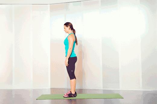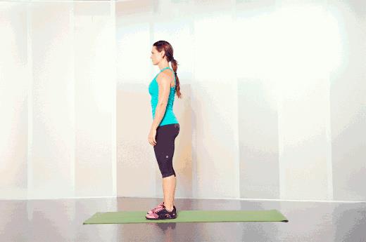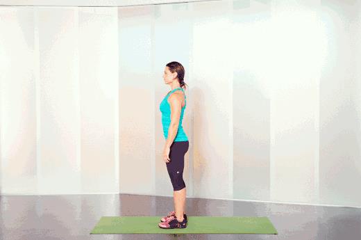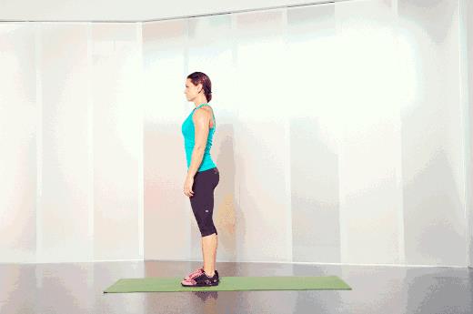 双脚自然站立,屈膝使身体重心下降,同时伸出双手,从站姿换到俯卧姿势。