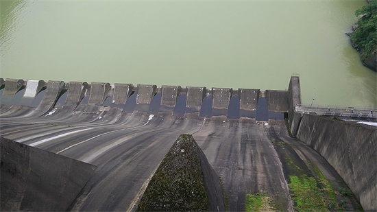 由厂房乘电梯直达坝顶,左顾右盼里的坝体耸成一爿遐想:上游库区两岸翠绿,汛期与非汛期水位落差痕迹裸露,那是电力人偏爱的景致,那是大坝泄洪和机组发电多寡的“吃水”标记哩;大坝下游峡谷悠雅地向右弯曲,宛若一幅秀水缠绕城镇的靓丽风情画卷。