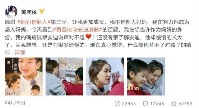 黄圣依也在节目中说到,安迪是在加拿大出生的,由于工作比较忙。也只陪伴了安迪四个月,安迪是跟着爷爷奶奶长大的,所以安迪跟着黄圣依生活肯定会有矛盾产生。但是,黄圣依也在网上发布了一篇自己的内心独白,以后会腾出更多的时间陪伴孩子。