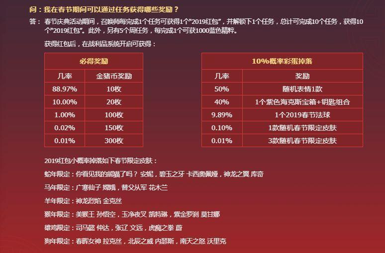 红包有什么用呢?请看红包的奖励,100%给10个代币,也有可能额外开出代币,并且有几率开出永久表情,海克斯紫色宝箱和钥匙,春节法球,往年春节限定皮肤,代币则是可以兑换东西,10个红包最少能获得100个代币,要注意哟,这个活动是免费获得的,并且完成一个之后会自动开启下一个任务,一共10个任务,各位小伙伴要注意这个任务的进度哟!