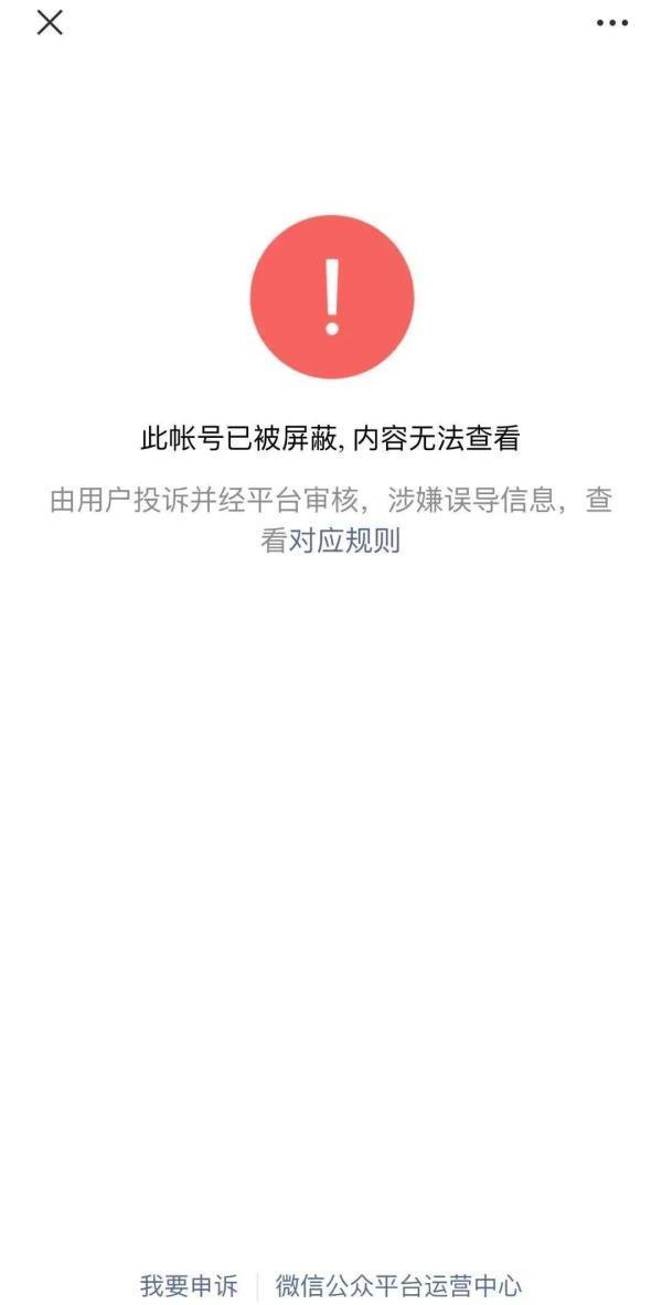 截至16日上午10时,涉公众号此前发布的多篇相关文章已经无法查看,目前显示“此账号已被屏蔽”。