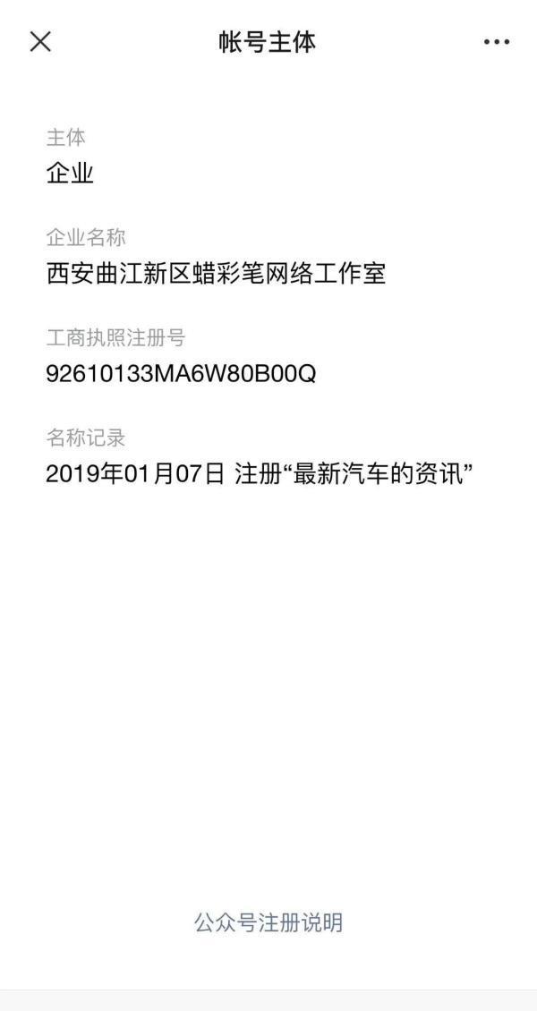 据公开信息显示,这个公众号注册公司为陕西省西安市曲江新区蜡笔网络工作室,于2019年1月7日注册公众账号“最新汽车的资讯”。