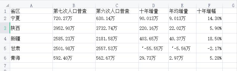 具体到西北五个省区,砖家通过查阅国家统计局最新公布的第七次人口普查数据,制作了一张数据表格,可以非常清晰地横向对比出五个省区从2010年到2020年期间人口增长变化。