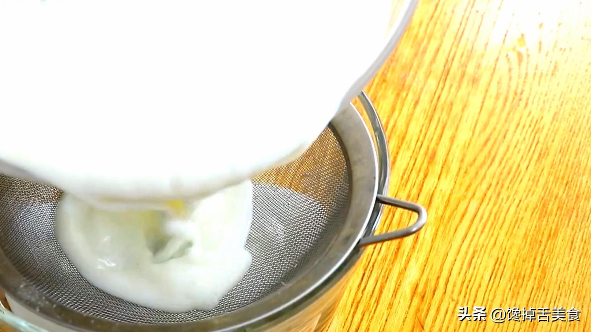 再用过滤器过滤一遍,这样会更加的细腻,这样同时也能把,气泡和没有搅匀的蛋清过滤出来,然后盖上一层保鲜膜。