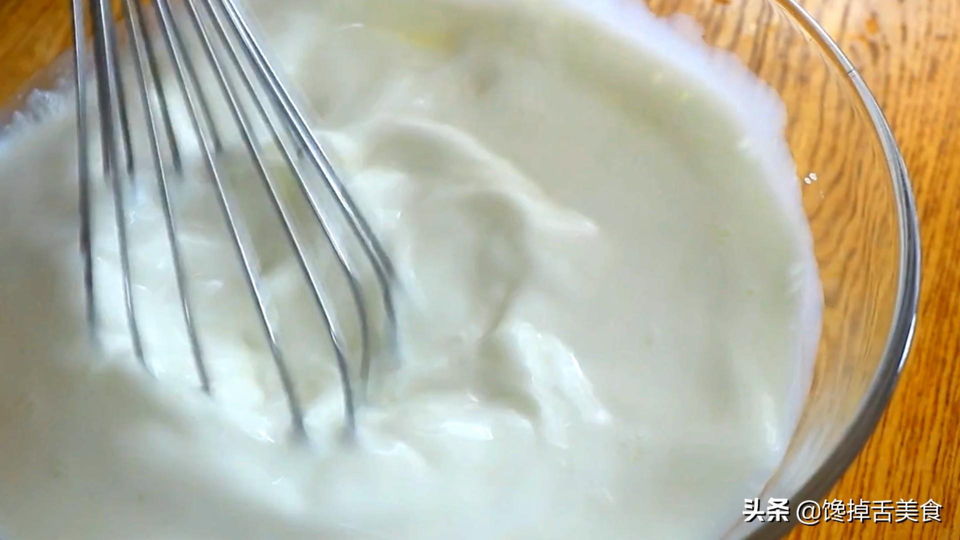 冷却的牛奶倒入蛋清里面,只剩下表面结出的奶皮,用搅打器充分的把它搅打均匀。