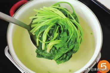 5. 烧适量水,加入盐,水开后,焯一下菠菜,颜色变深后,捞起沥水待用。