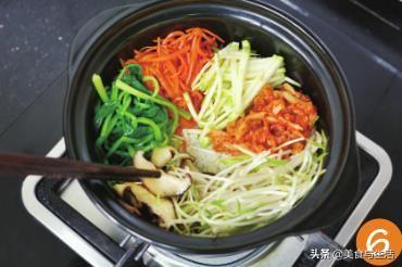 6. 米饭蒸好离火前, 迅速在锅内摆入胡萝卜丝、西葫芦丝、绿豆芽、香菇片、菠菜和泡菜。
