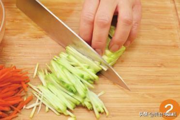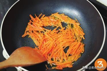 3. 炒锅烧热,放入橄榄油,中火煸炒胡萝卜丝,变软,捞出待用。