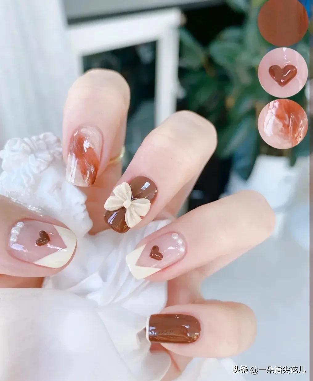 第四款:焦糖色系晕染+V型法式边、爱心彩绘+珍珠饰品(短指甲款可爱风)